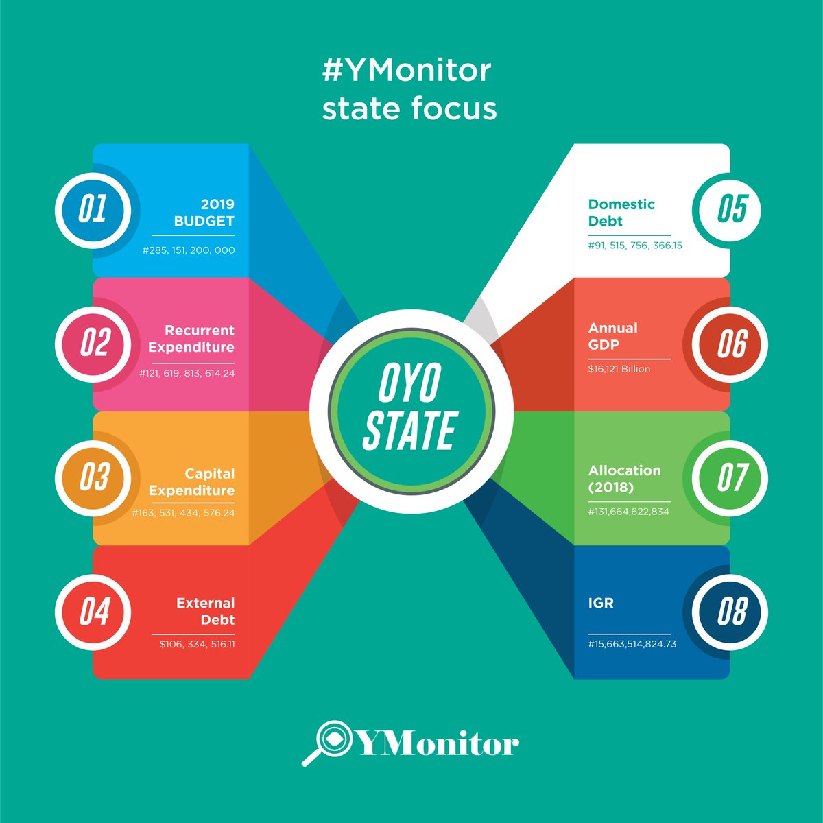 Oyo state has a Domestic Debt of N91, 515, 756, 366.15, while its external debt stands at $106, 334, 516. 11. Her annual GDP is $16,121 billion. Federal Allocation (2018): N131,664,622,834 and her IGR in the previous year is N15,663,514,824.73.